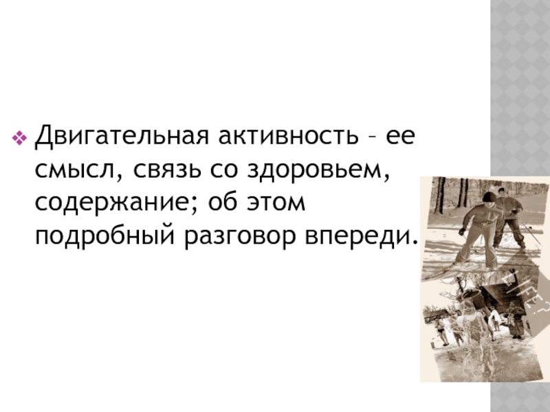 Слайд 3Двигательная активность – ее смысл, связь со здоровьем, содержание; об этом