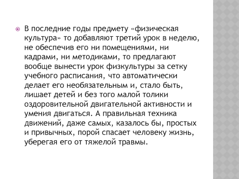 неделю, не обеспечив его ни помещениями, ни кадрами, ни методиками, то предлагают вообще вынести урок физкультуры за сетку учебного расписания, что автоматически делает его необязательным и, стало быть, лишает детей и без того малой толики оздоровительной двигательной активности и умения двигаться. А правильная техника движений, даже самых, казалось бы, простых и привычных, порой спасает человеку жизнь, уберегая его от тяжелой травмы.