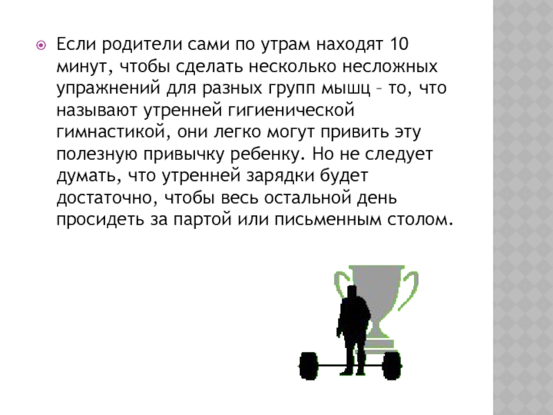 несложных упражнений для разных групп мышц – то, что называют утренней гигиенической гимнастикой, они легко могут привить эту полезную привычку ребенку. Но не следует думать, что утренней зарядки будет достаточно, чтобы весь остальной день просидеть за партой или письменным столом.