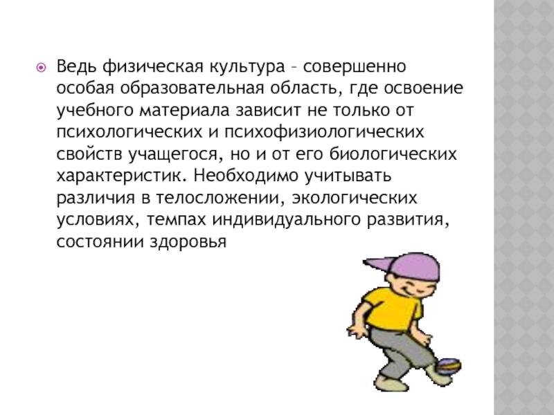 Слайд 28Ведь физическая культура – совершенно особая образовательная область, где освоение учебного