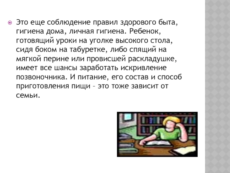 готовящий уроки на уголке высокого стола, сидя боком на табуретке, либо спящий на мягкой перине или провисшей раскладушке, имеет все шансы заработать искривление позвоночника. И питание, его состав и способ приготовления пищи – это тоже зависит от семьи.
