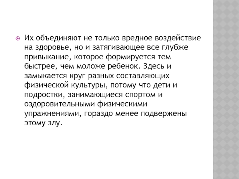 все глубже привыкание, которое формируется тем быстрее, чем моложе ребенок. Здесь и замыкается круг разных составляющих физической культуры, потому что дети и подростки, занимающиеся спортом и оздоровительными физическими упражнениями, гораздо менее подвержены этому злу.