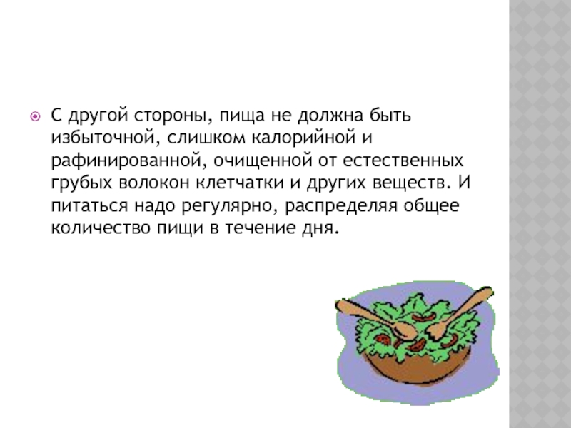 Слайд 7С другой стороны, пища не должна быть избыточной, слишком калорийной и