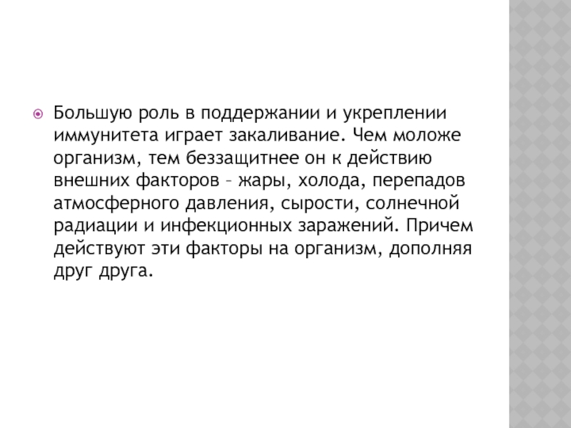 Слайд 15Большую роль в поддержании и укреплении иммунитета играет закаливание. Чем моложе