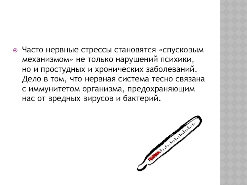 Слайд 14Часто нервные стрессы становятся «спусковым механизмом» не только нарушений психики, но