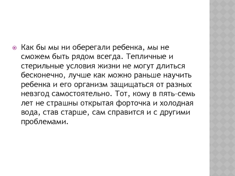 всегда. Тепличные и стерильные условия жизни не могут длиться бесконечно, лучше как можно раньше научить ребенка и его организм защищаться от разных невзгод самостоятельно. Тот, кому в пять–семь лет не страшны открытая форточка и холодная вода, став старше, сам справится и с другими проблемами.
