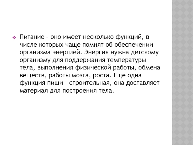об обеспечении организма энергией. Энергия нужна детскому организму для поддержания температуры тела, выполнения физической работы, обмена веществ, работы мозга, роста. Еще одна функция пищи – строительная, она доставляет материал для построения тела.