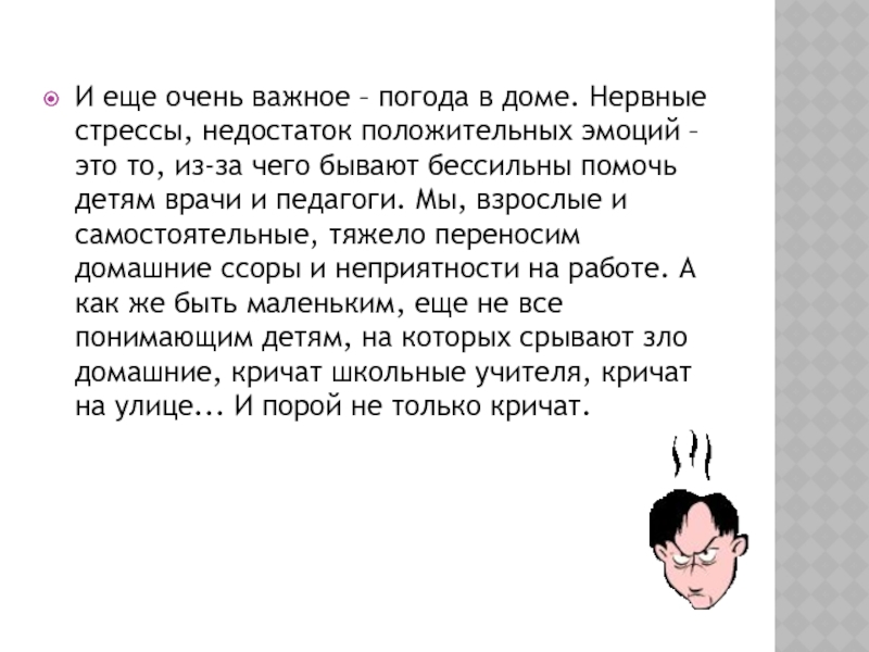 Слайд 13И еще очень важное – погода в доме. Нервные стрессы, недостаток