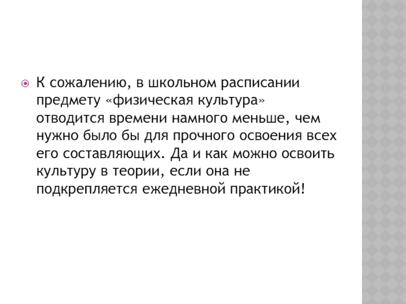 Слайд 23К сожалению, в школьном расписании предмету «физическая культура» отводится времени намного