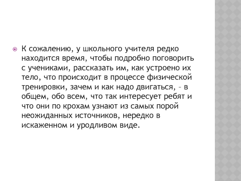 с учениками, рассказать им, как устроено их тело, что происходит в процессе физической тренировки, зачем и как надо двигаться, – в общем, обо всем, что так интересует ребят и что они по крохам узнают из самых порой неожиданных источников, нередко в искаженном и уродливом виде.