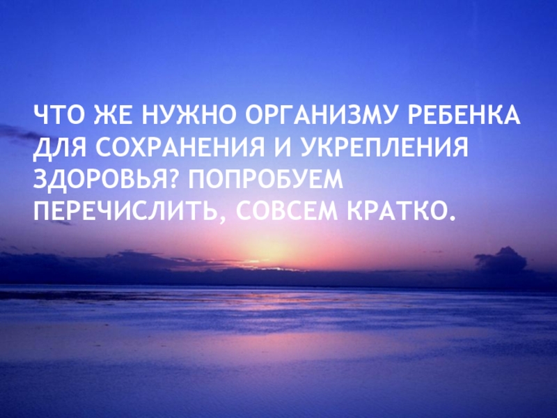 Слайд 2ЧТО ЖЕ НУЖНО ОРГАНИЗМУ РЕБЕНКА ДЛЯ СОХРАНЕНИЯ И УКРЕПЛЕНИЯ ЗДОРОВЬЯ? ПОПРОБУЕМ