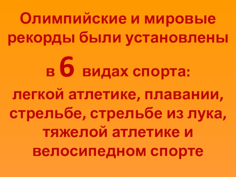 Олимпийские и мировые рекорды были установлены в 6 видах спорта: легкой атлетике, плавании, стрельбе, стрельбе из лука,