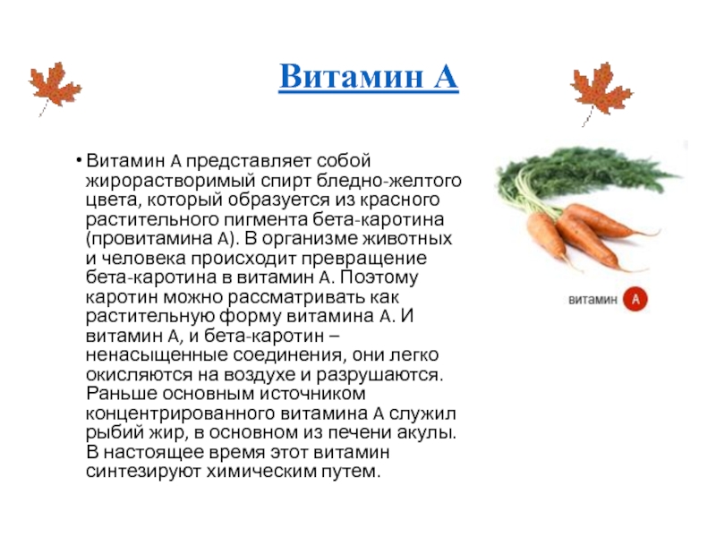 образуется из красного растительного пигмента бета-каротина (провитамина A). В организме животных и человека происходит превращение бета-каротина в витамин A. Поэтому каротин можно рассматривать как растительную форму витамина A. И витамин A, и бета-каротин – ненасыщенные соединения, они легко окисляются на воздухе и разрушаются. Раньше основным источником концентрированного витамина A служил рыбий жир, в основном из печени акулы. В настоящее время этот витамин синтезируют химическим путем.