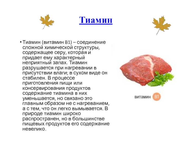 и придает ему характерный неприятный запах. Тиамин разрушается при нагревании в присутствии влаги; в сухом виде он стабилен. В процессе приготовления пищи или консервирования продуктов содержание тиамина в них уменьшается, но связано это главным образом не с нагреванием, а с тем, что он легко вымывается. В природе тиамин широко распространен, но в большинстве пищевых продуктов его содержание невелико.