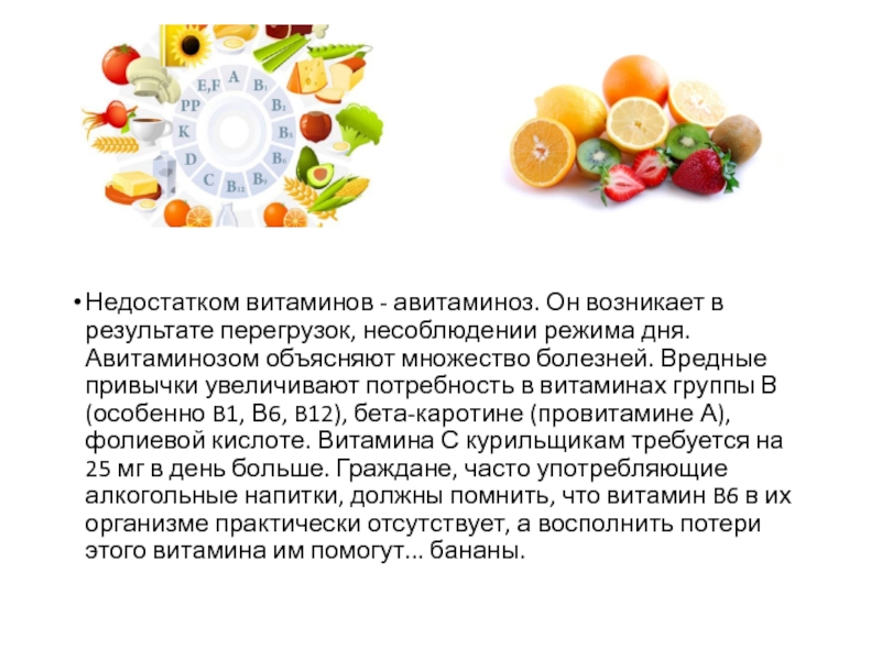 дня. Авитаминозом объясняют множество болезней. Вредные привычки увеличивают потребность в витаминах группы В (особенно B1, В6, B12), бета-каротине (провитамине А), фолиевой кислоте. Витамина С курильщикам требуется на 25 мг в день больше. Граждане, часто употребляющие алкогольные напитки, должны помнить, что витамин B6 в их организме практически отсутствует, а восполнить потери этого витамина им помогут... бананы.