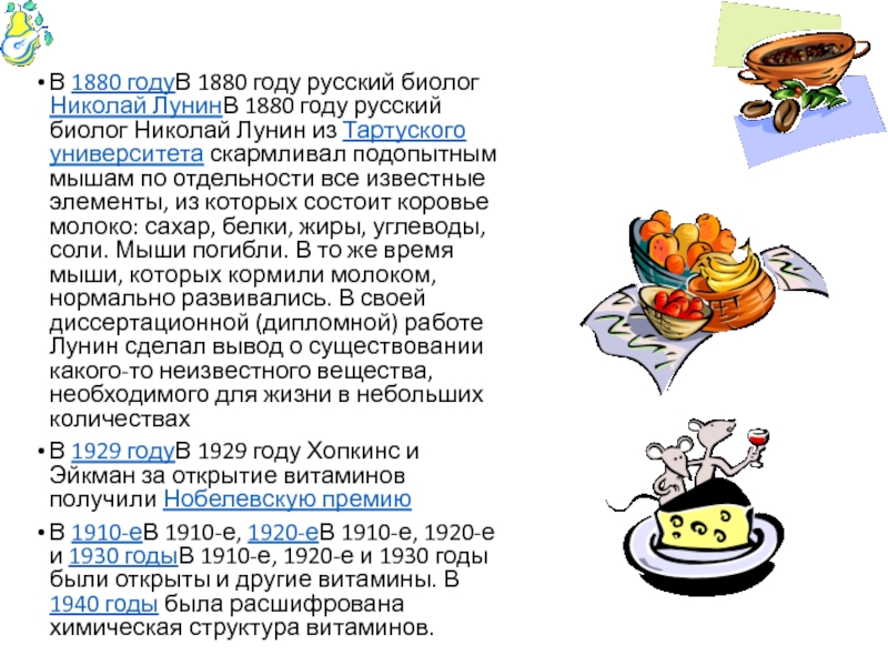 Слайд 5В 1880 годуВ 1880 году русский биолог Николай ЛунинВ 1880 году русский биолог Николай