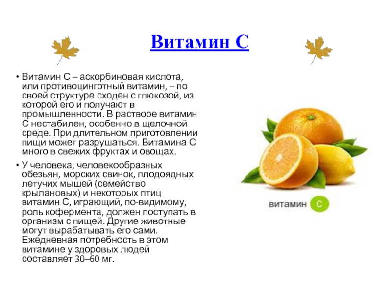 своей структуре сходен с глюкозой, из которой его и получают в промышленности. В растворе витамин С нестабилен, особенно в щелочной среде. При длительном приготовлении пищи может разрушаться. Витамина С много в свежих фруктах и овощах.