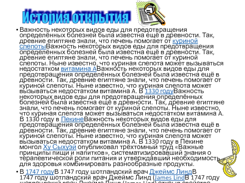 Слайд 4Важность некоторых видов еды для предотвращения определённых болезней была известна ещё