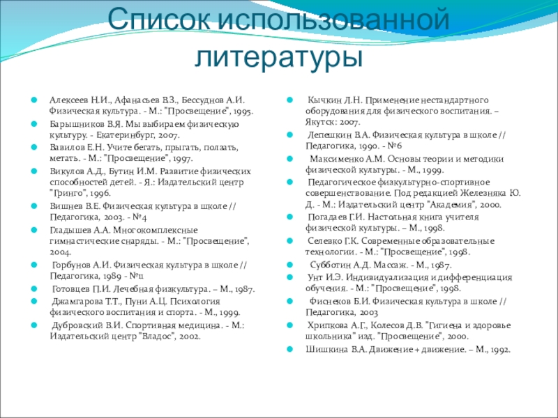 Кычкин Л.Н. Применение нестандартного оборудования для физического воспитания. – Якутск: 2007.