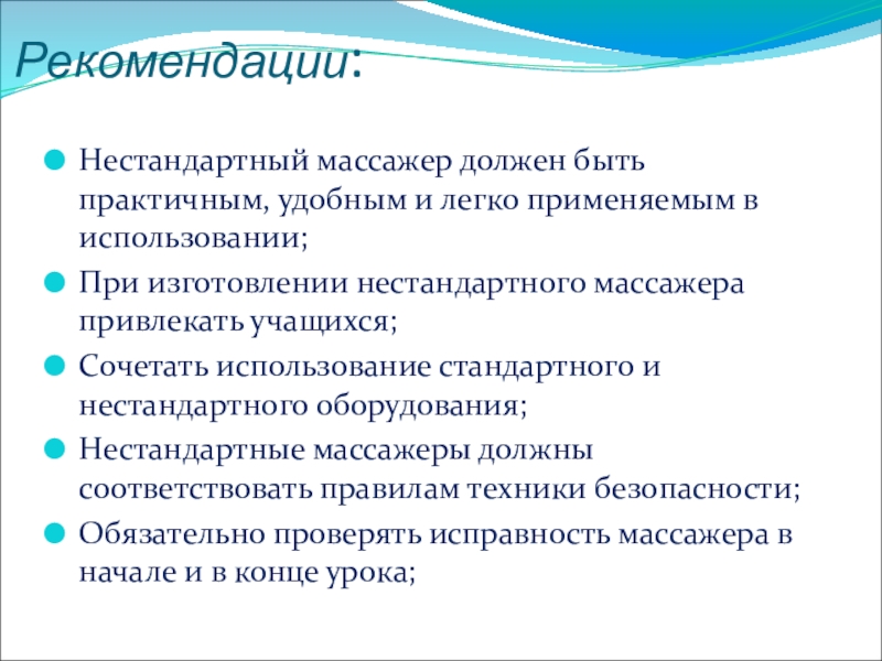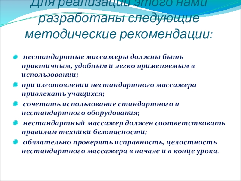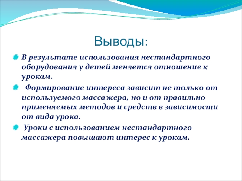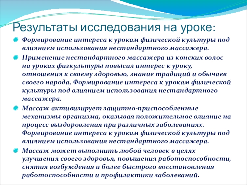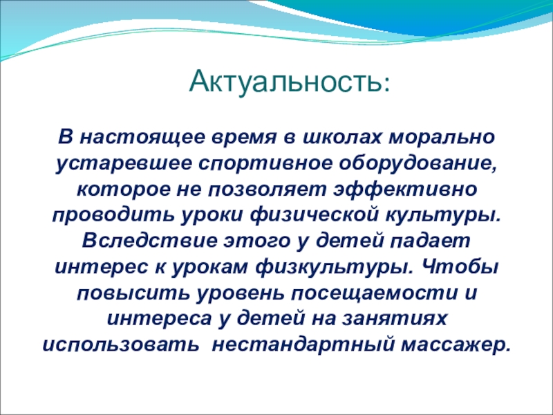 В настоящее время в школах морально устаревшее спортивное оборудование, которое не позволяет эффективно проводить уроки физической культуры. Вследствие этого у детей падает интерес к урокам физкультуры. Чтобы повысить уровень посещаемости и интереса у детей на занятиях использовать нестандартный массажер.