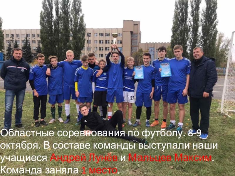 Слайд 35Областные соревнования по футболу. 8-9 октября. В составе команды выступали наши