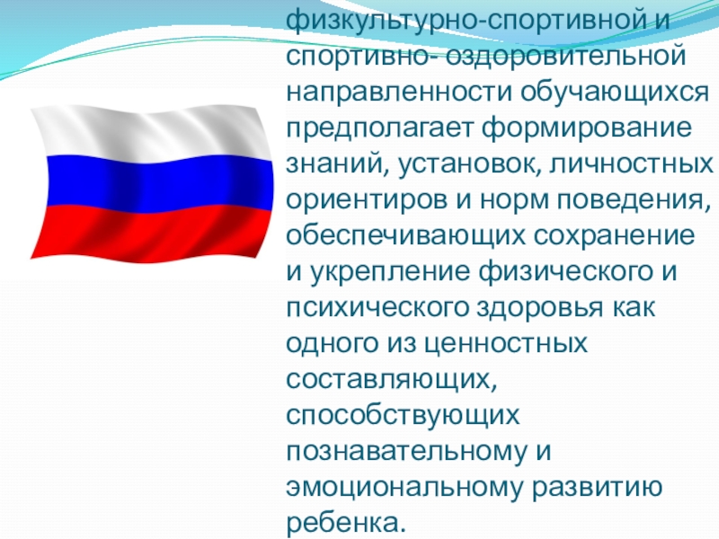 установок, личностных ориентиров и норм поведения, обеспечивающих сохранение и укрепление физического и психического здоровья как одного из ценностных составляющих, способствующих познавательному и эмоциональному развитию ребенка.