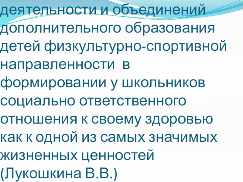 в формировании у школьников социально ответственного отношения к своему здоровью как к одной из самых значимых жизненных ценностей (Лукошкина В.В.)