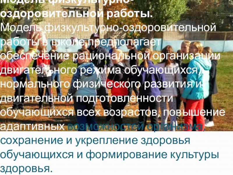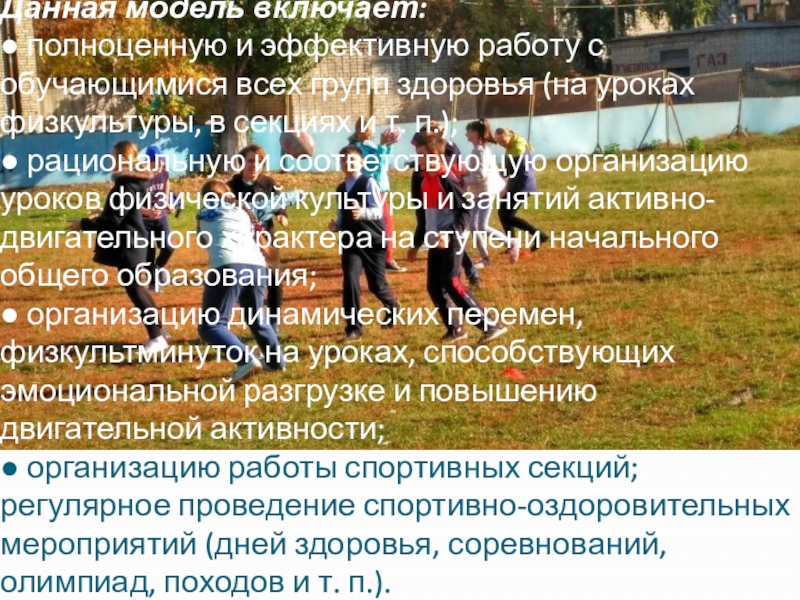 Модель физкультурно-оздоровительной работы в школе предполагает обеспечение рациональной организации