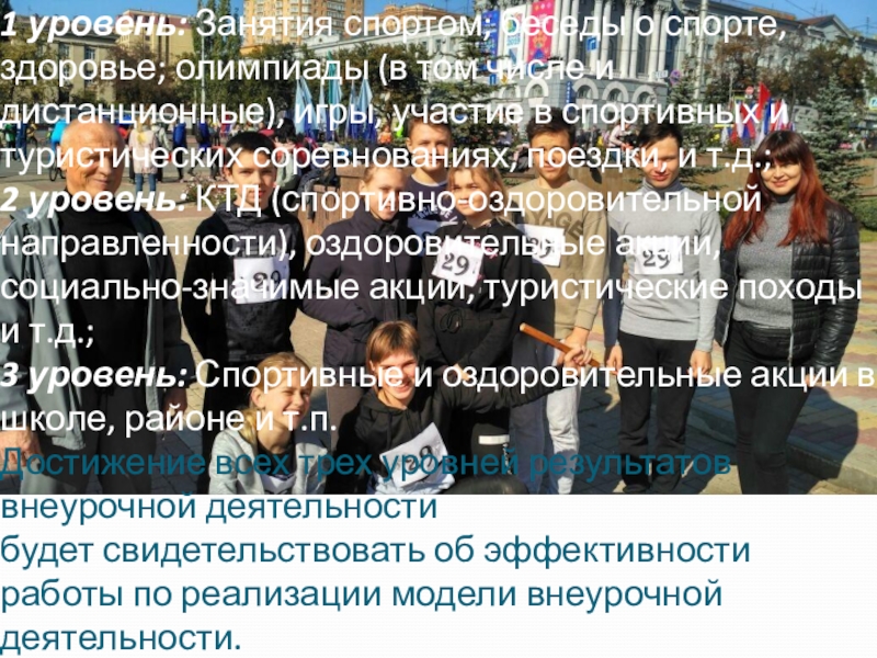 2 уровень: КТД (спортивно-оздоровительной направленности), оздоровительные акции, социально-значимые акции, туристические походы и т.д.;