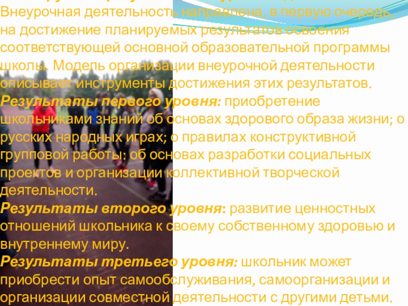 планируемых результатов освоения соответствующей основной образовательной программы школы. Модель организации внеурочной деятельности описывает инструменты достижения этих результатов.