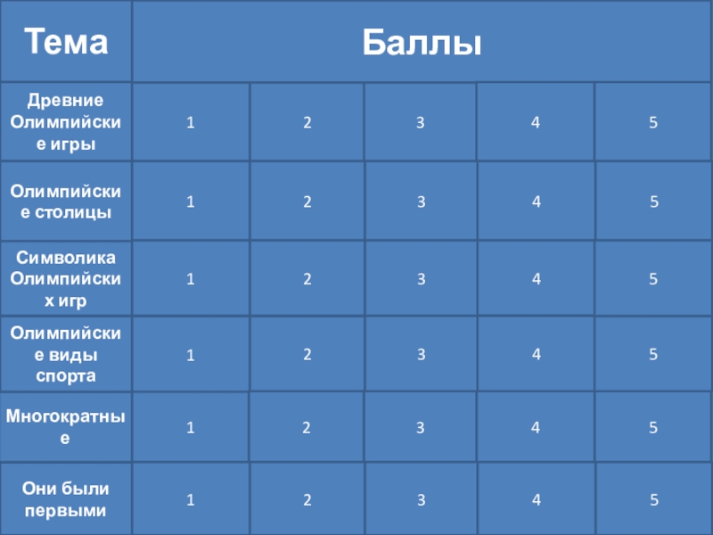 ТемаОлимпийские столицыДревние Олимпийские игрыМногократныеОлимпийские виды спортаСимволика Олимпийских игрБаллы1111122222333334444455555Они были первыми12345