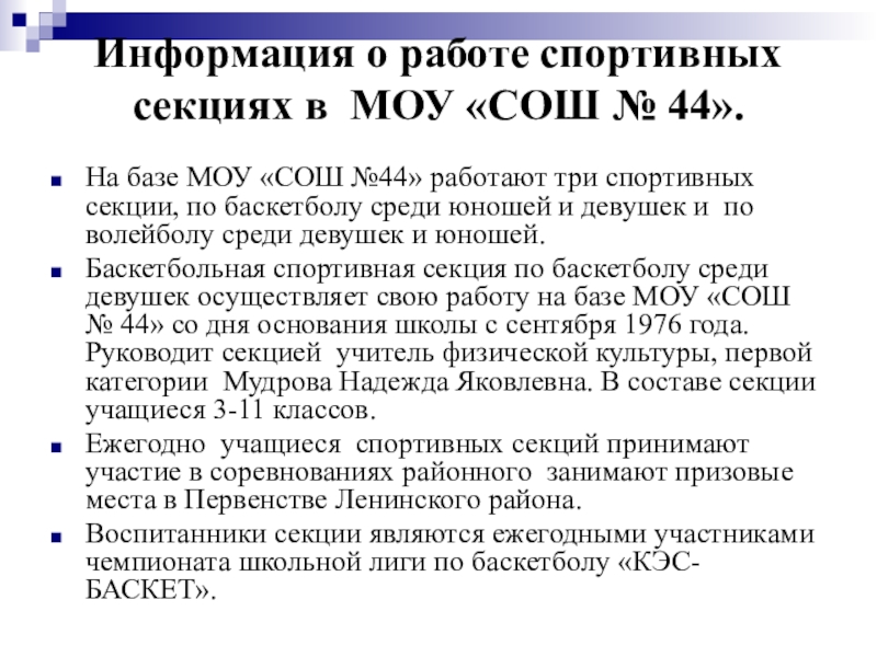 Баскетбольная спортивная секция по баскетболу среди девушек осуществляет свою работу на базе МОУ «СОШ № 44» со дня основания школы с сентября 1976 года. Руководит секцией учитель физической культуры, первой категории Мудрова Надежда Яковлевна. В составе секции учащиеся 3-11 классов.
