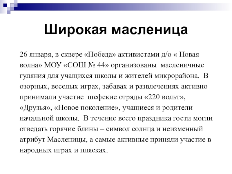 МОУ «СОШ № 44» организованы масленичные гуляния для учащихся школы и жителей микрорайона. В озорных, веселых играх, забавах и развлечениях активно принимали участие шефские отряды «220 вольт», «Друзья», «Новое поколение», учащиеся и родители начальной школы. В течение всего праздника гости могли отведать горячие блины – символ солнца и неизменный атрибут Масленицы, а самые активные приняли участие в народных играх и плясках.