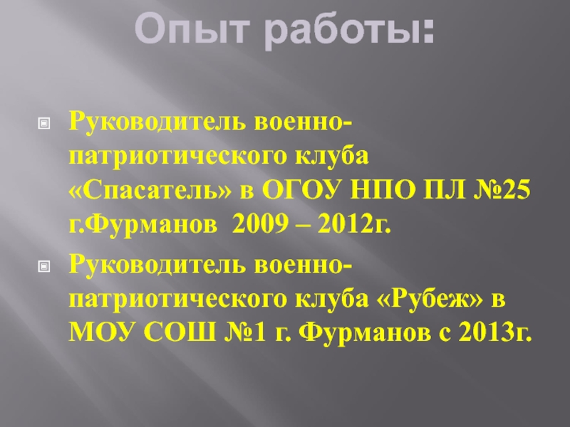 Опыт работы: Руководитель военно-патриотического клуба «Спасатель» в ОГОУ НПО ПЛ №25 г.Фурманов 2009 – 2012г.Руководитель военно-патриотического клуба