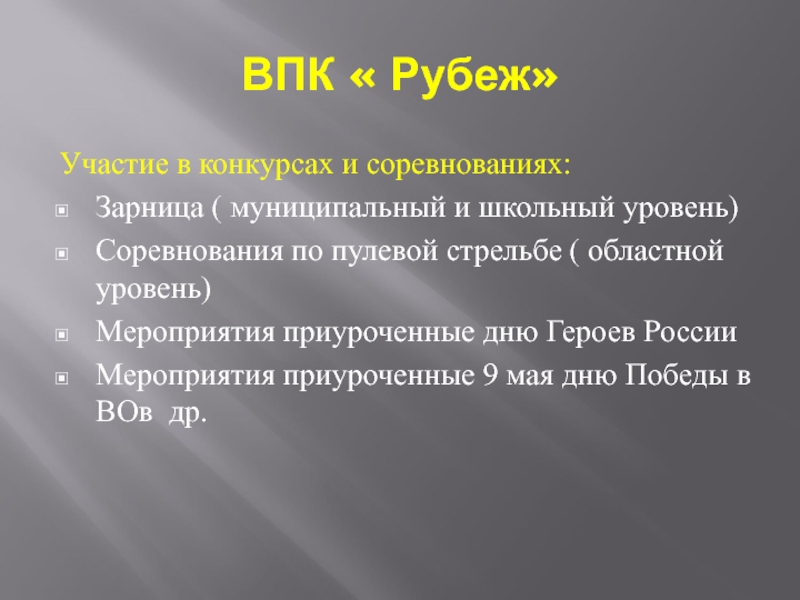 ВПК « Рубеж»Участие в конкурсах и соревнованиях:Зарница ( муниципальный и школьный уровень)Соревнования по пулевой стрельбе ( областной