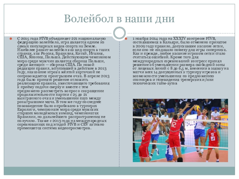1 ноября 2014 года на XXXIV конгрессе FIVB, состоявшемся в Кальяри, было отменено принятое в 2009 году правило, допускавшее касание сетки, если оно не создавало помеху для игры соперника. Как и прежде, любое касание игроком сетки стало считаться ошибкой. Кроме того для международных соревнований конгресс принял решение об уменьшении размера свободной зоны от лицевых линий с 8 до 6,5 м, внесении в заявку на матчи всех 14 допущенных к турниру игроков и возможности уменьшения по предложению спонсоров и телевидения тренерских и/или технических тайм-аутов