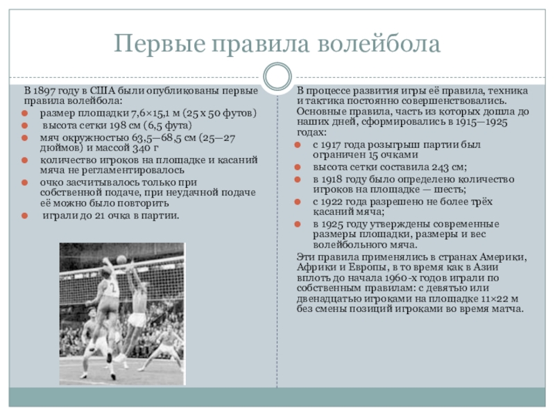 в 1925 году утверждены современные размеры площадки, размеры и вес волейбольного мяча.