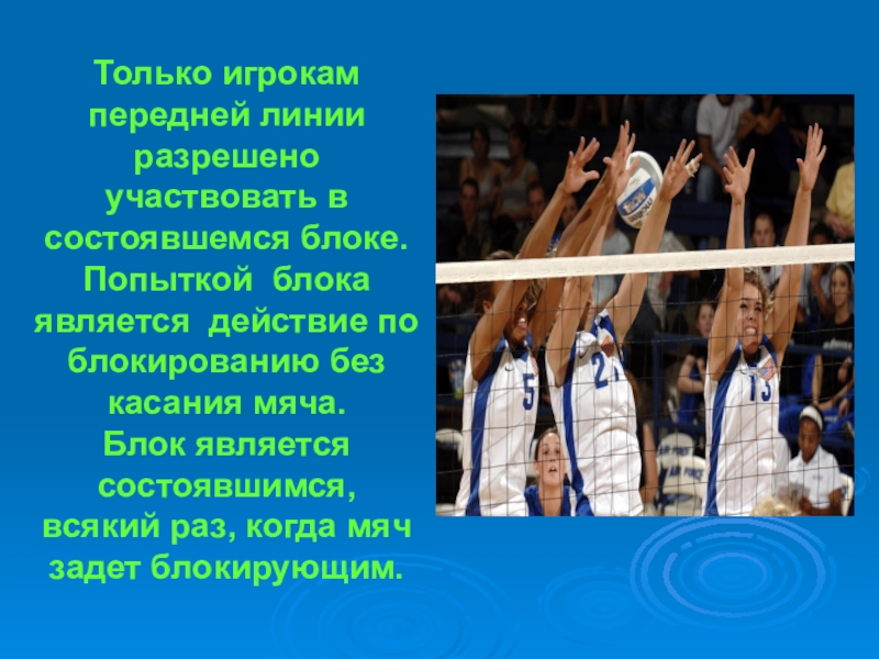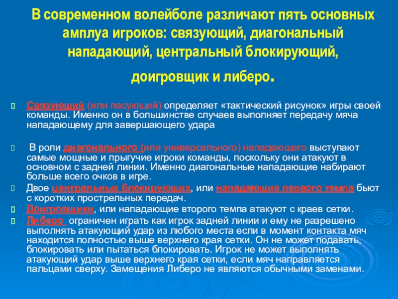 Либеро ограничен играть как игрок задней линии и ему не разрешено выполнять атакующий удар из любого места если в момент контакта мяч находится полностью выше верхнего края сетки. Он не может подавать, блокировать или пытаться блокировать. Игрок не может выполнять атакующий удар выше верхнего края сетки, если мяч направляется пальцами сверху. Замещения Либеро не являются обычными заменами.
