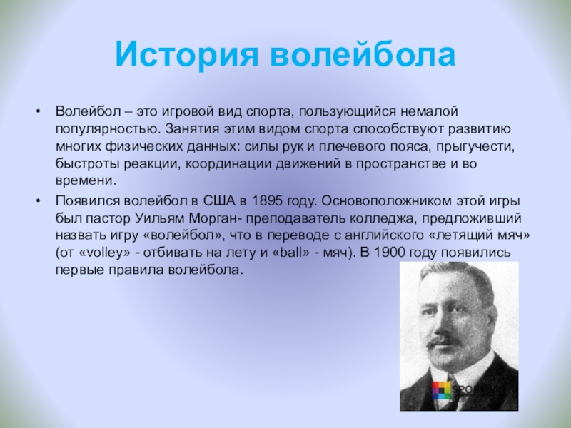 Появился волейбол в США в 1895 году. Основоположником этой игры был пастор Уильям Морган- преподаватель колледжа, предложивший назвать игру «волейбол», что в переводе с английского «летящий мяч» (от «volley» - отбивать на лету и «ball» - мяч). В 1900 году появились первые правила волейбола.