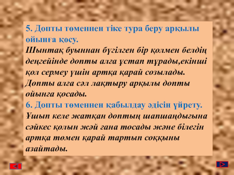 5. Допты төменнен тіке тура беру арқылы ойынға қосу.Шынтақ буыннан бүгілген бір қолмен белдің деңгейінде допты алға
