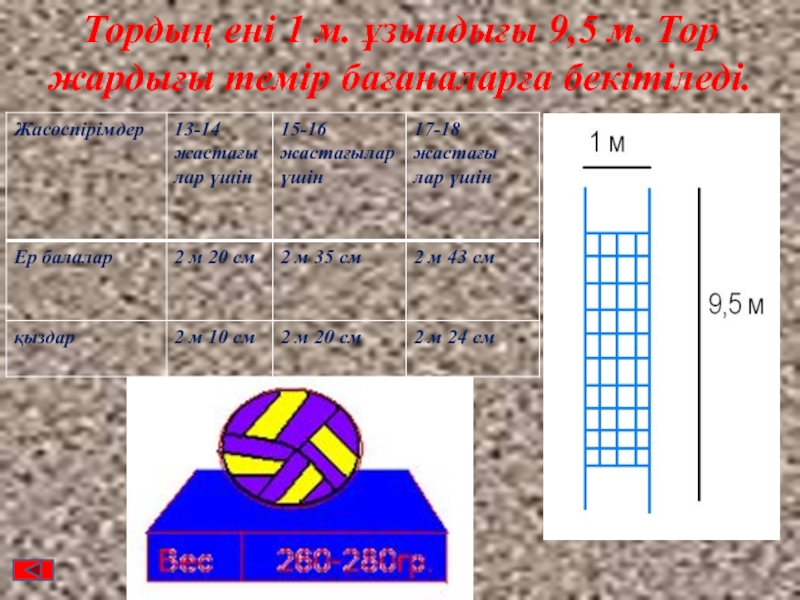 Слайд 4Тордың ені 1 м. ұзындығы 9,5 м. Тор жардығы темір бағаналарға