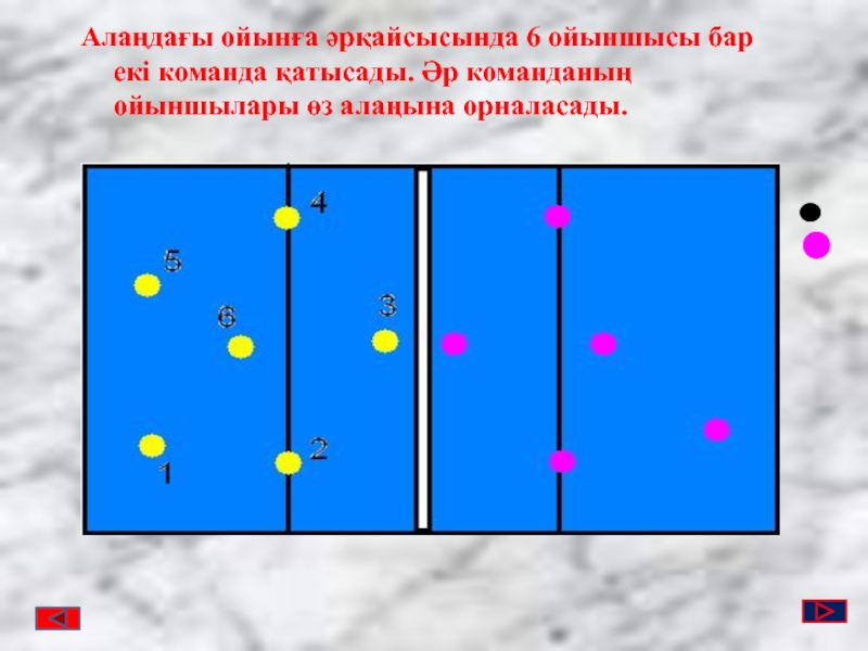 Алаңдағы ойынға әрқайсысында 6 ойыншысы бар екі команда қатысады. Әр команданың