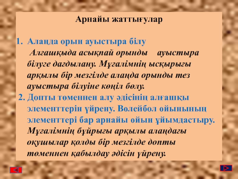 2. Допты төменнен алу әдісінің алғашқы элементтерін үйрену. Волейбол ойынының элементтері бар арнайы ойын ұйымдастыру.