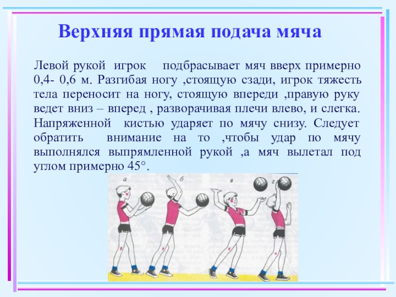 0,4- 0,6 м. Разгибая ногу ,стоящую сзади, игрок тяжесть тела переносит на ногу, стоящую впереди ,правую руку ведет вниз – вперед , разворачивая плечи влево, и слегка. Напряженной кистью ударяет по мячу снизу. Следует обратить внимание на то ,чтобы удар по мячу выполнялся выпрямленной рукой ,а мяч вылетал под углом примерно 45°.