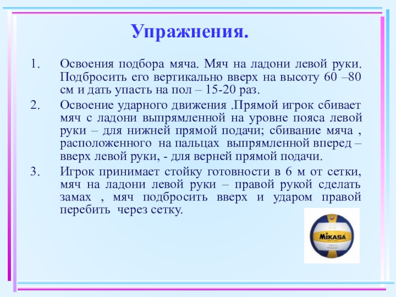Игрок принимает стойку готовности в 6 м от сетки, мяч на ладони левой руки – правой рукой сделать замах , мяч подбросить вверх и ударом правой перебить через сетку.