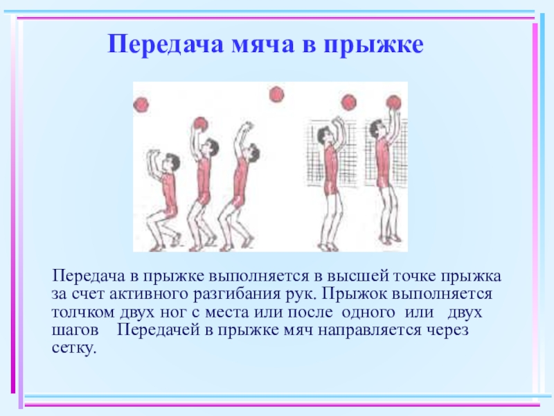 прыжка за счет активного разгибания рук. Прыжок выполняется толчком двух ног с места или после одного или двух шагов Передачей в прыжке мяч направляется через сетку.