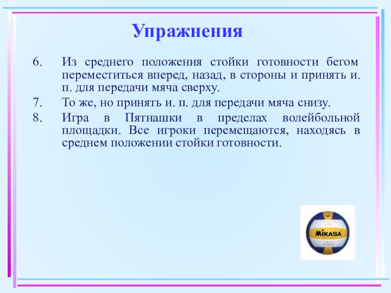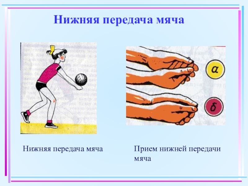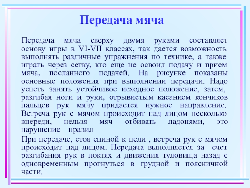 касание мяча руками должно быть кратковременным и отрывистым, задерживать мяч нельзя. Это требует умения быстро передвигаться по площадке, чтобы своевременно выйти к мячу и занять удобное исходное положение. В VI- VII классах изучаются: