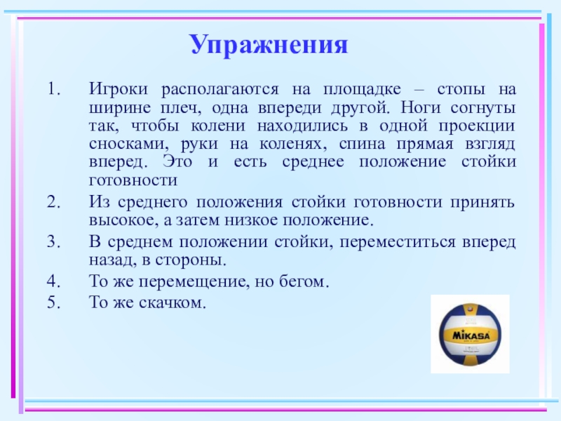 через сетку высокого мяча будет средняя; перед передачей через сетку — высокая . Обычно в стойке одна нога впереди или ступни расположены параллельно. В положении стойки игрок или неподвижен, или переступает с ноги на ногу в ожидании мяча (переминается). Передвигается волейболист в игре обычным шагом, приставным шагом, бегом. Способы передвижения часто сочетаются: после