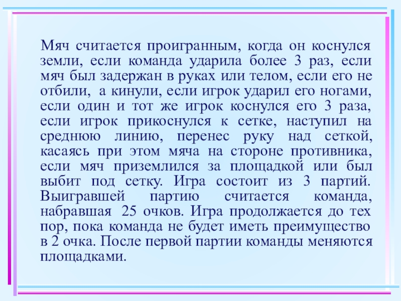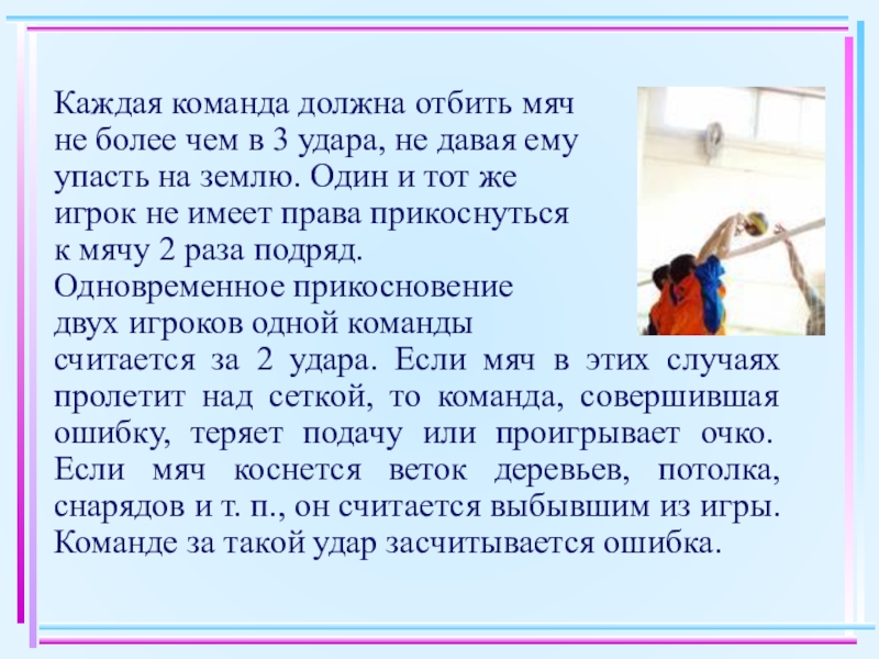 Слайд 6Мяч считается проигранным, когда он коснулся земли, если команда ударила более