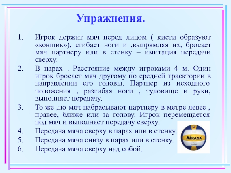 и ,выпрямляя их, бросает мяч партнеру или в стенку – имитация передачи сверху.